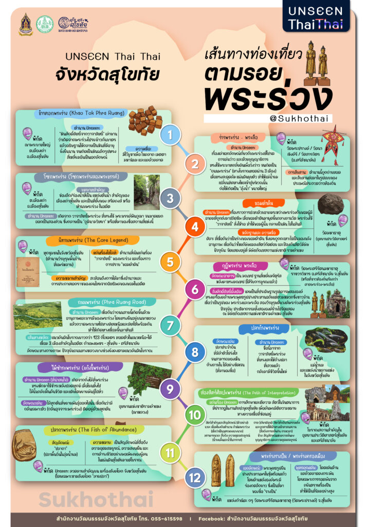 จังหวัดสุโขทัย โดย สำนักงานวัฒนธรรมจังหวัดสุโขทัย จัดเส้นทาง 12 รายการเด่นใน “เส้นทางท่องเที่ยวตามรอยพระร่วง” เส้นทางนี้ประกอบด้วยสถานที่และตำนานสำคัญที่สะท้อนให้เห็นถึงมิติทางประวัติศาสตร์และวัฒนธรรมของอาณาจักรสุโขทัย ดังนี้