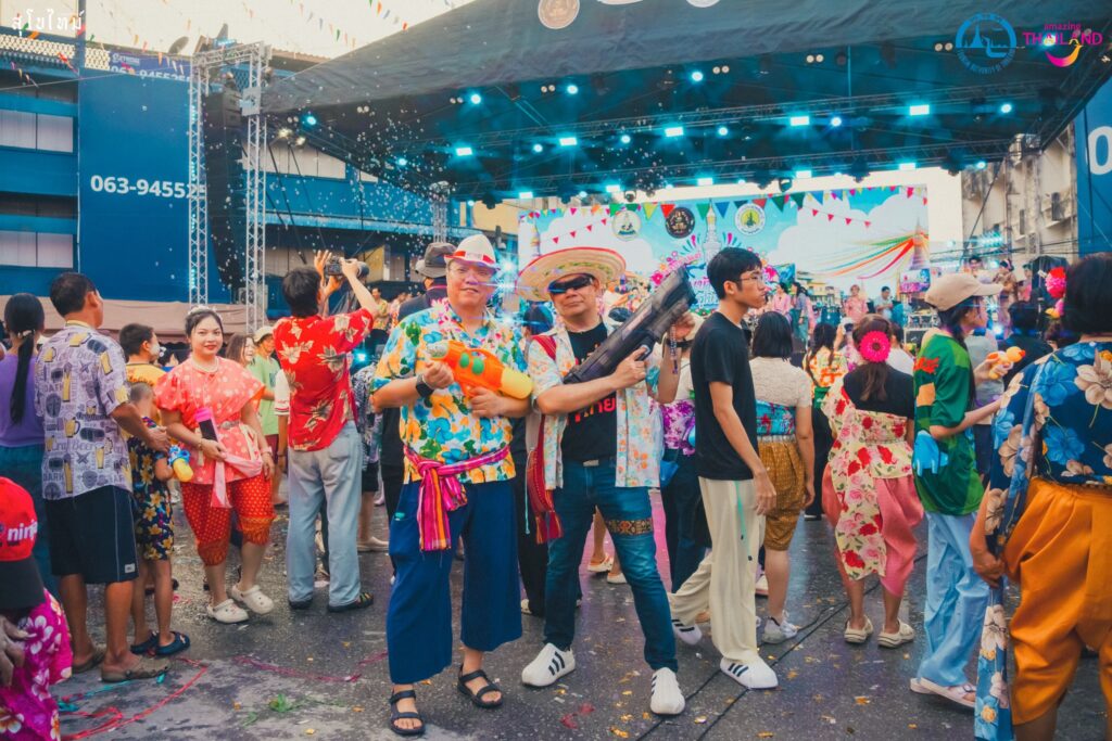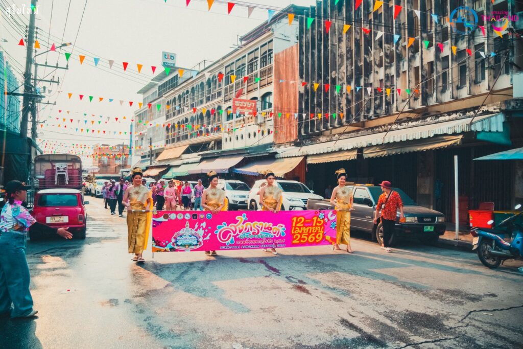 บรรยากาศบนถนนข้าวตอกในปีนี้คึกคักเป็นพิเศษด้วยขบวนพาเหรดจาก ททท. สำนักงานสุโขทัย และขบวนศิลปวัฒนธรรมจาก ๑๒ ชุมชนในเขตเทศบาลเมืองสุโขทัยธานี ที่ต่างนำเสนอเอกลักษณ์อันโดดเด่นของตนเองผ่านการตกแต่งรถขบวนอย่างประณีต ผสมผสานกับการแต่งกายด้วย “เสื้อลายดอก” สีสันสดใส ซึ่งเป็นสัญลักษณ์ของความสนุกสนานในเทศกาลสงกรานต์ แต่ยังคงไว้ด้วยร่องรอยแห่งอารยธรรมสุโขทัย เช่น การประดับประดาด้วยลายสังคโลกและผ้าทอพื้นเมือง