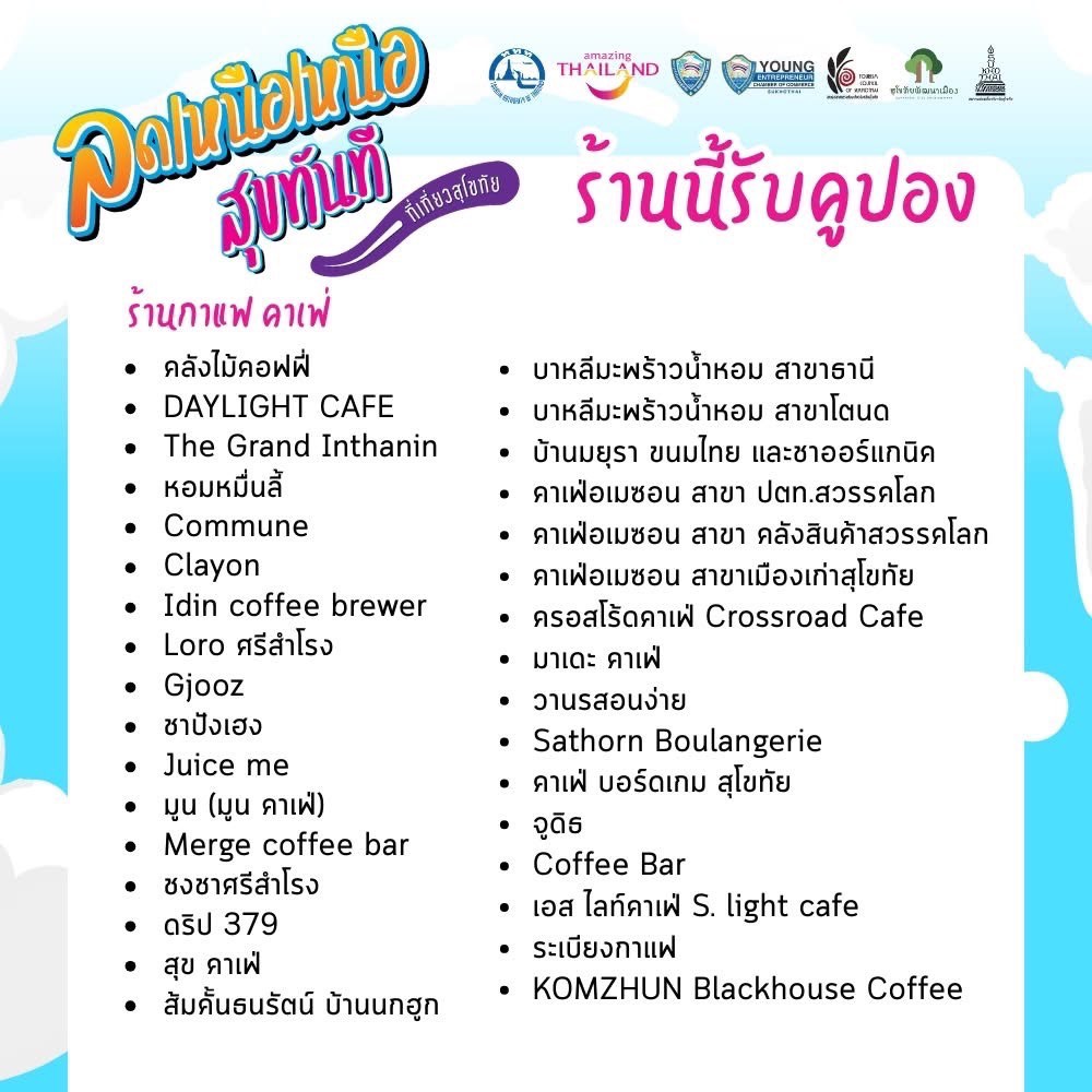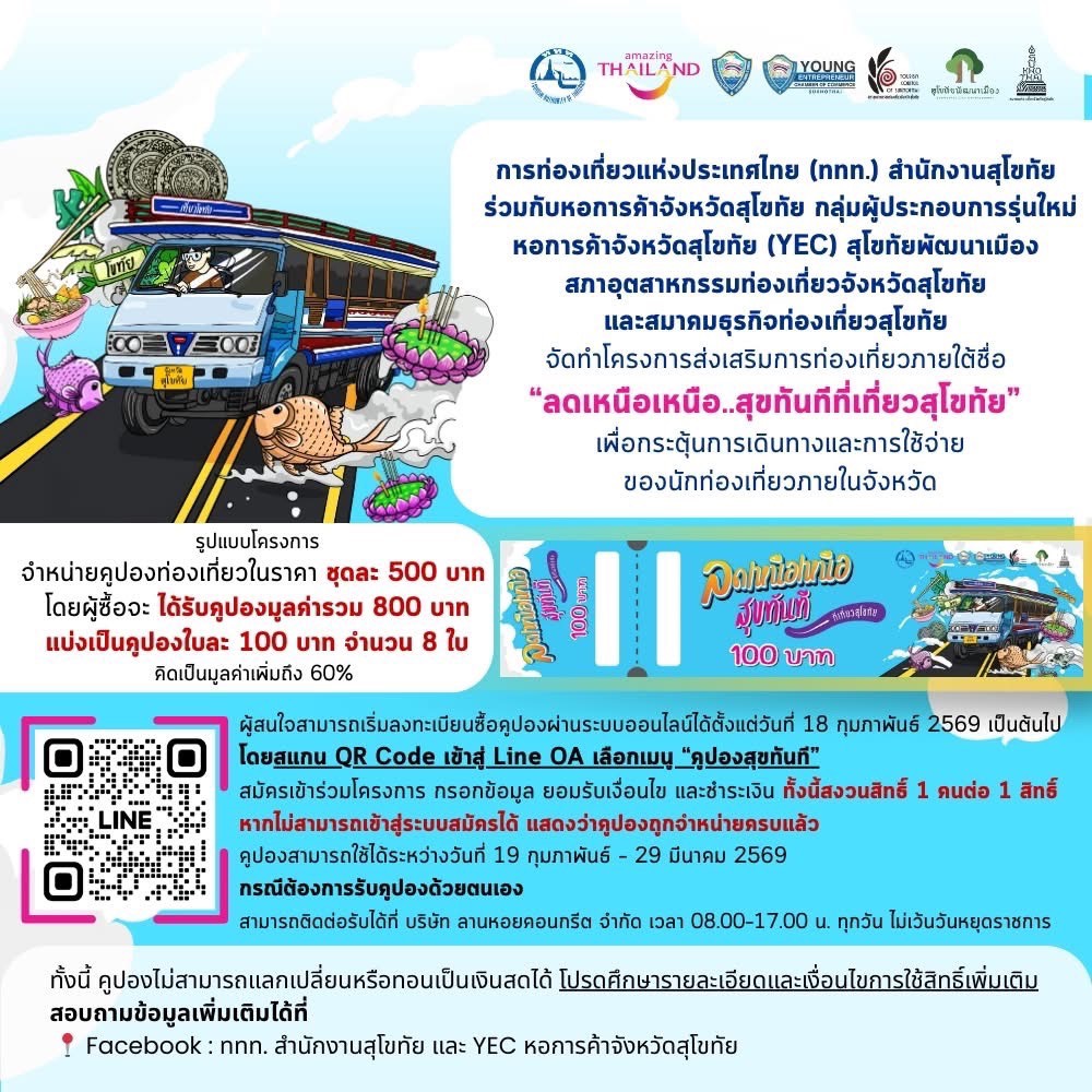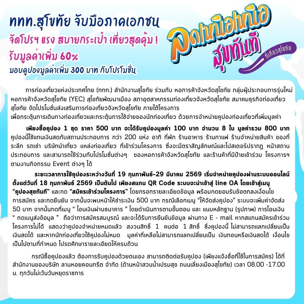 สำหรับผู้ที่สนใจสามารถตรวจสอบรายชื่อสถานประกอบการที่เข้าร่วมโครงการได้ที่เพจ Facebook: YEC Sukhothai หรือสอบถามข้อมูลเพิ่มเติมได้ที่ ททท. สำนักงานสุโขทัย โทร. 0 5561 6228-9